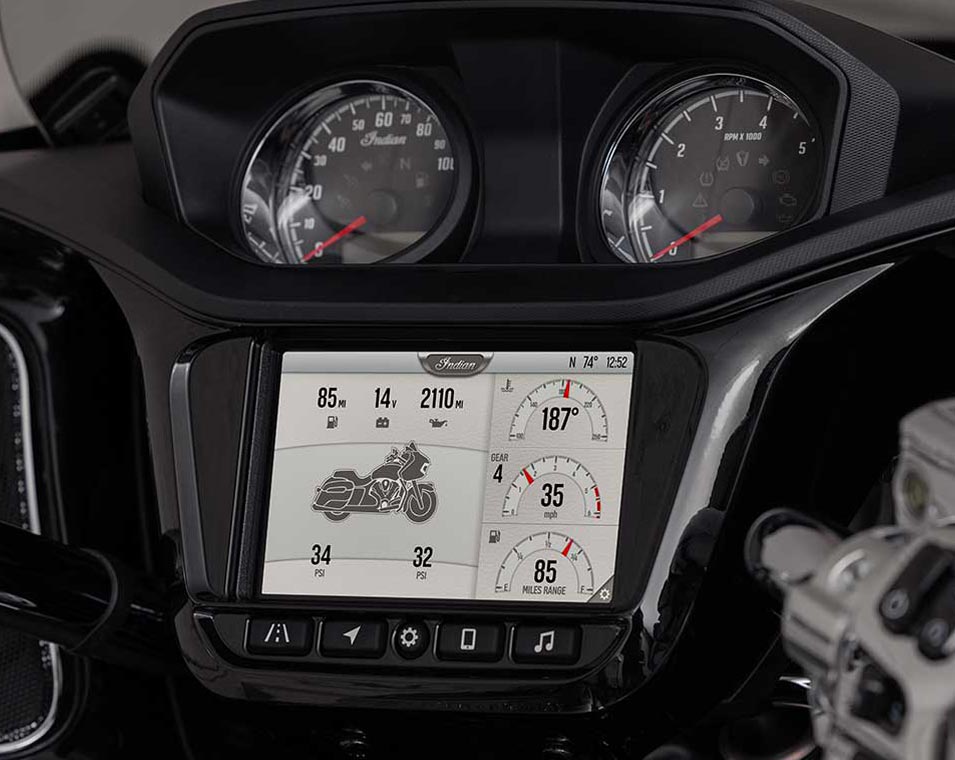 | Infotainment | 7" touchscreen powered by RIDE COMMAND. 7" touchscreen display with real-time clock; ambient air temperature; heading; audio information display; map/navigation; Bluetooth status for phone and headset; vehicle status (tyre pressure, voltage, engine hours, oil change); vehicle info (speed, fuel range, RPM, gear position); current ride data (distance, moving time, stop time, altitude, altitude change); trip meters; ride mode selection; screen brightness; vehicle trouble code readout; Apple CarPlay integration. |