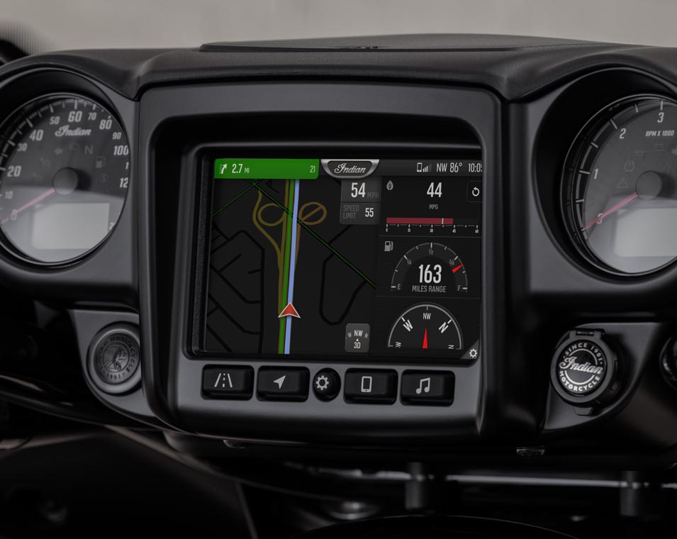 | Infotainment | 7" touchscreen powered by RIDE COMMAND. 7" touchscreen display with real-time clock; ambient air temperature; heading; audio information display; map/navigation; Bluetooth status for phone and headset; vehicle status (tyre pressure, voltage, engine hours, oil change); vehicle info (speed, fuel range, RPM, gear position); current ride data (distance, moving time, stop time, altitude, altitude change); trip meters; ride mode selection; screen brightness; vehicle trouble code readout; Apple CarPlay integration. |